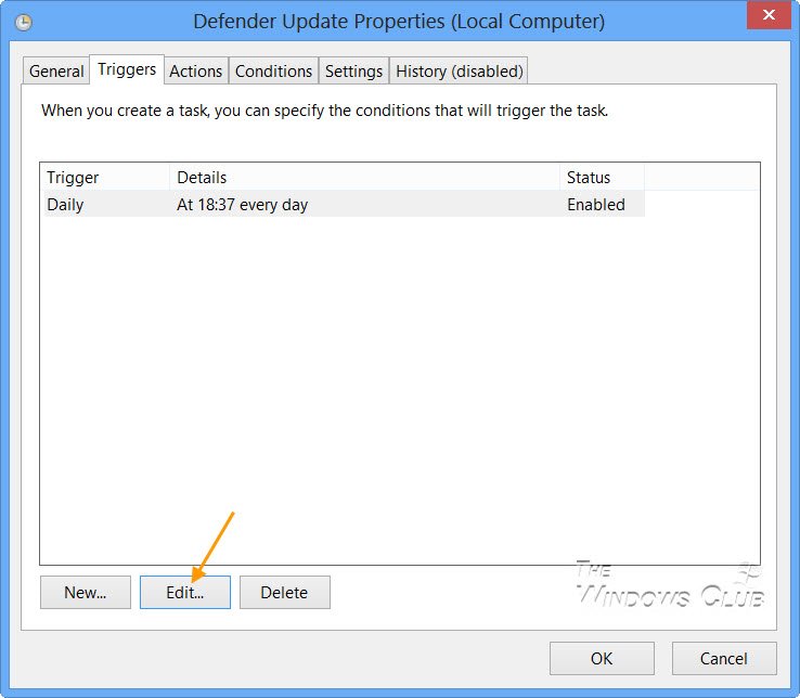 Open up its Properties box and click on the Triggers tab. Select the task and click on Edit.
